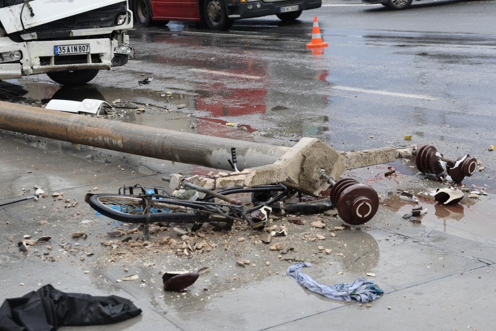 Aydın-Denizli kara yolunda gerçekleşen kazada, bir kamyonun neden olduğu zincirleme çarpışma sonucu devrilen beton elektrik direği, yoldan geçen bir bisikletlinin hayatına mal oldu.