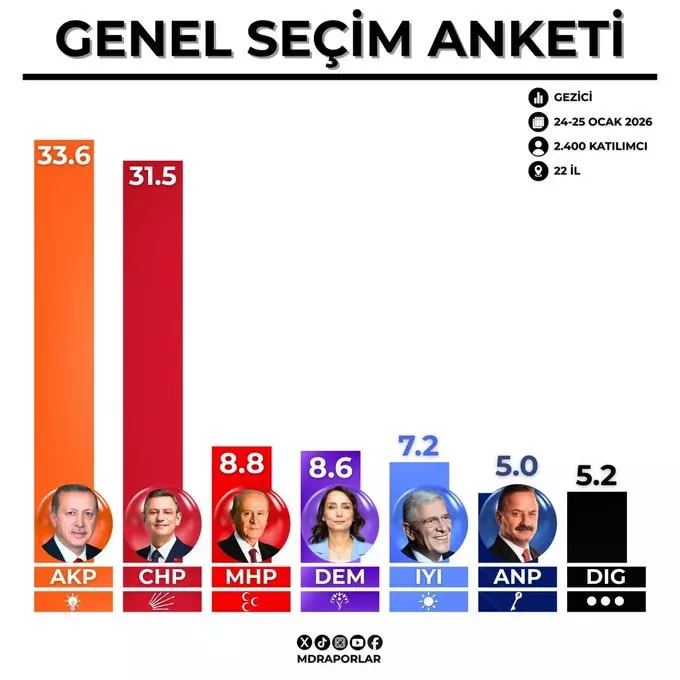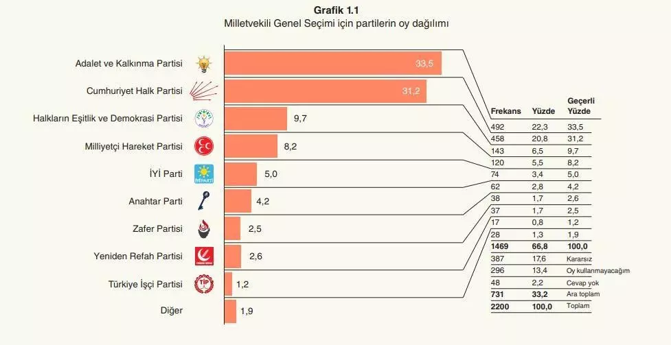 Ankete göre Recep Tayyip Erdoğan liderliğindeki AK Parti yüzde 33,6 oy oranıyla birinci sırada yer aldı.