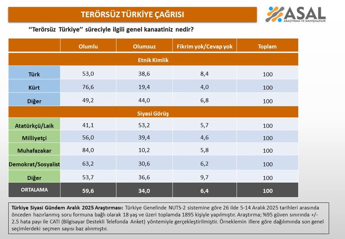 Kasım 2025’te yapılan ölçümde “Terörsüz Türkiye” sürecine olumlu yaklaşanların oranı yüzde 55,8 olarak kaydedilmişti. Aralık 2025 anketinde bu oran yüzde 59,6’ya çıktı. Böylece bir ay içinde 3,8 puanlık artış yaşandı. Aynı dönemde sürece olumsuz bakanların oranı değişmeyerek her iki ayda da yüzde 34 olarak ölçüldü.