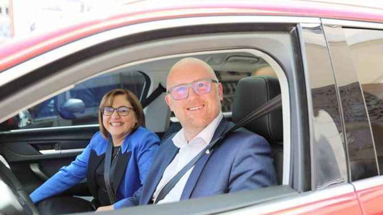Türkiye’nin yerli ve milli otomobili TOGG ile Gaziantep sokaklarında gezen Sören Link, Büyükşehir Belediyesi Başkanlık Binası’ndan Kardeş Şehir olunması nedeniyle şehrinin adının verildiği Duisburg Caddesi’ne kadar aracı sürdü.