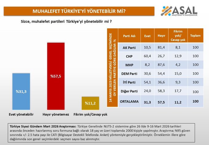 Araştırma sonuçlarına göre katılımcıların yüzde 57,5’i muhalefet partilerinin Türkiye’yi yönetemeyeceğini düşünüyor. Buna karşılık “Evet yönetebilir” diyenlerin oranı yüzde 31,3’te kaldı. Kararsız ya da görüş belirtmeyenlerin oranı ise yüzde 11,2 olarak ölçüldü.