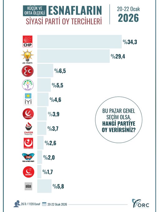 ORC Araştırma, 20-22 Ocak 2026 tarihleri arasında küçük ve orta ölçekli esnaf ile ev kadınlarıyla gerçekleştirdiği kamuoyu araştırmasının sonuçlarını paylaştı. “Bu pazar genel seçim olsa hangi partiye oy verirsiniz?” sorusunun yöneltildiği ankette, her iki seçmen grubunda da CHP’nin ilk sırada yer alması dikkat çekti.