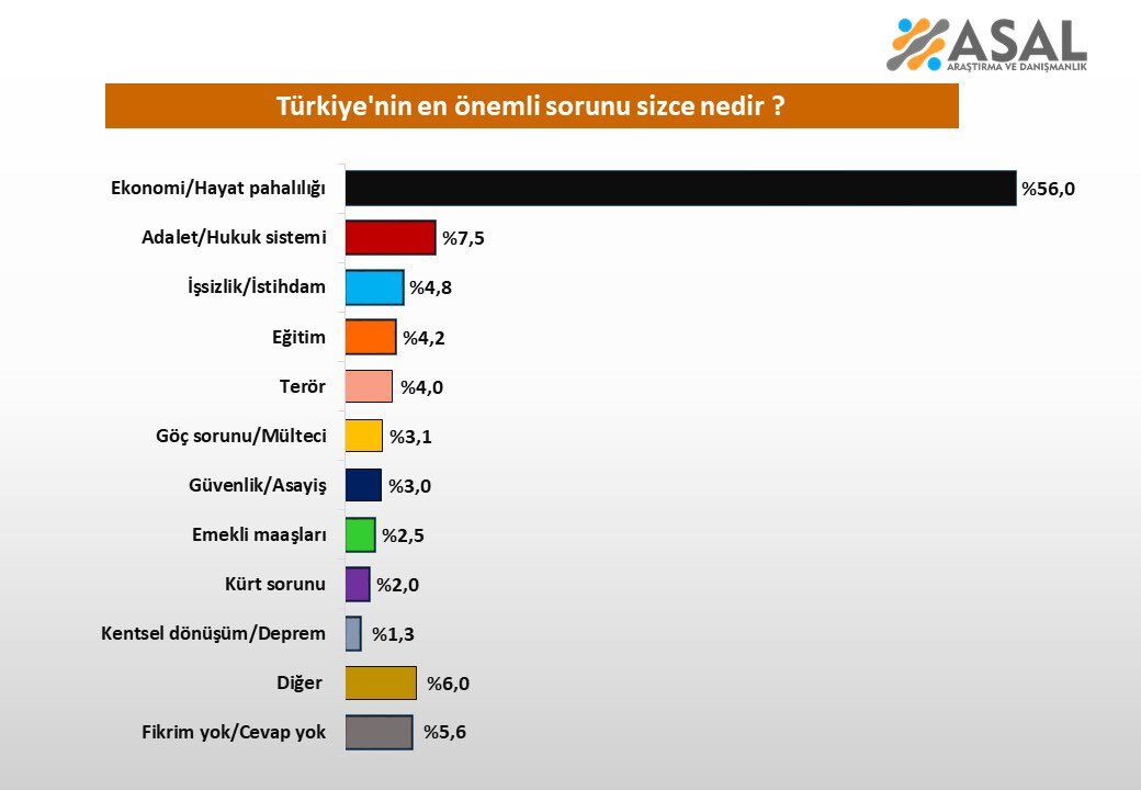 ASAL Araştırma tarafından 2 bin 15 kişiyle gerçekleştirilen ankete göre, Türkiye’nin en önemli sorunu açık ara farkla ekonomi ve hayat pahalılığı olarak öne çıktı.