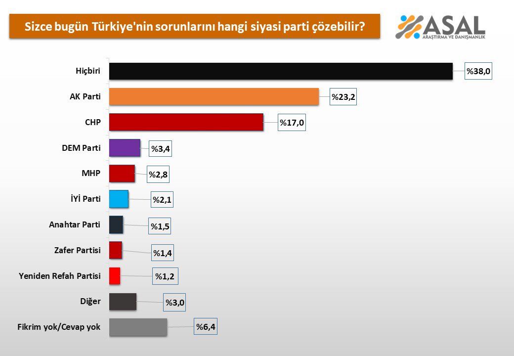 Araştırmada katılımcılara yöneltilen bir diğer soru ise Türkiye’nin sorunlarını hangi siyasi partinin çözebileceği oldu. Ankete göre en yüksek oran “hiçbiri” seçeneğinde toplandı. Katılımcıların yüzde 38’i mevcut siyasi partilerin hiçbirinin sorunları çözemeyeceğini düşündüğünü ifade etti.