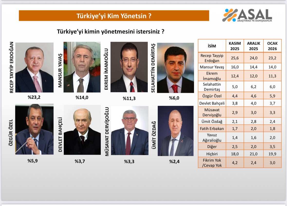 Anket sonuçlarına göre Cumhurbaşkanı Recep Tayyip Erdoğan, yüzde 23,2 oy oranıyla listenin zirvesinde yer aldı.