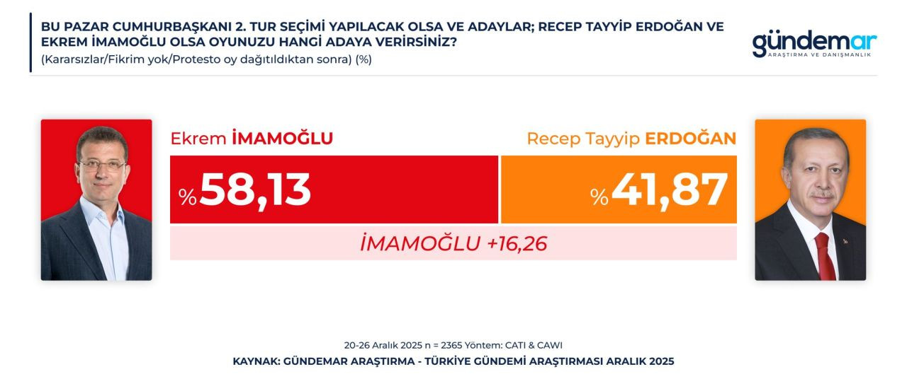 Gündemar Araştırma, 20-26 Aralık 2025 tarihleri arasında Türkiye genelinde 60 ilde toplam 2 bin 365 kişiyle yüz yüze ve telefon yöntemiyle bir saha çalışması gerçekleştirdi. Araştırmada katılımcılara hem genel seçim hem de cumhurbaşkanlığı seçimine ilişkin sorular yöneltildi.