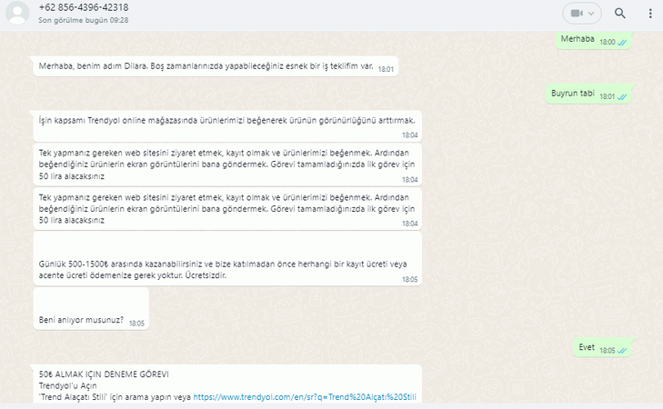 tek yapmanız gereken size göndereceğimiz linkteki ürünleri trendyol üzerinde aratarak bulmak ve sonrasında ürünleri beğenip yorum yapmak. daha sonra beğenip yorum yaptığınız ürünlerin ekran resimlerini bana gönderin. görevi tamamladığınız her ürün için size 50 lira ödeyeceğiz. bu işi sürekli yaparak günlük 500-2000 lira rahatlıkla kazanabilirsiniz. bu işi yapmaya hazır mısın?" yazısıyla birçok kişiyi dolandırdılar.