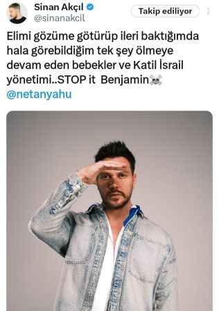 Sevilen şarkılarıyla ve kişiiğiyle milyonların gönlünde taht kuran Sinan Akçıl X hesabında Netanyahu’yu etiketleyerek, “Elimi gözüme götürüp ileri baktığımda hâlâ görebildiğim tek şey ölmeye devam eden bebekler ve katil İsrail yönetimi… STOP it Benjamin” ifadelerini kullandı.
