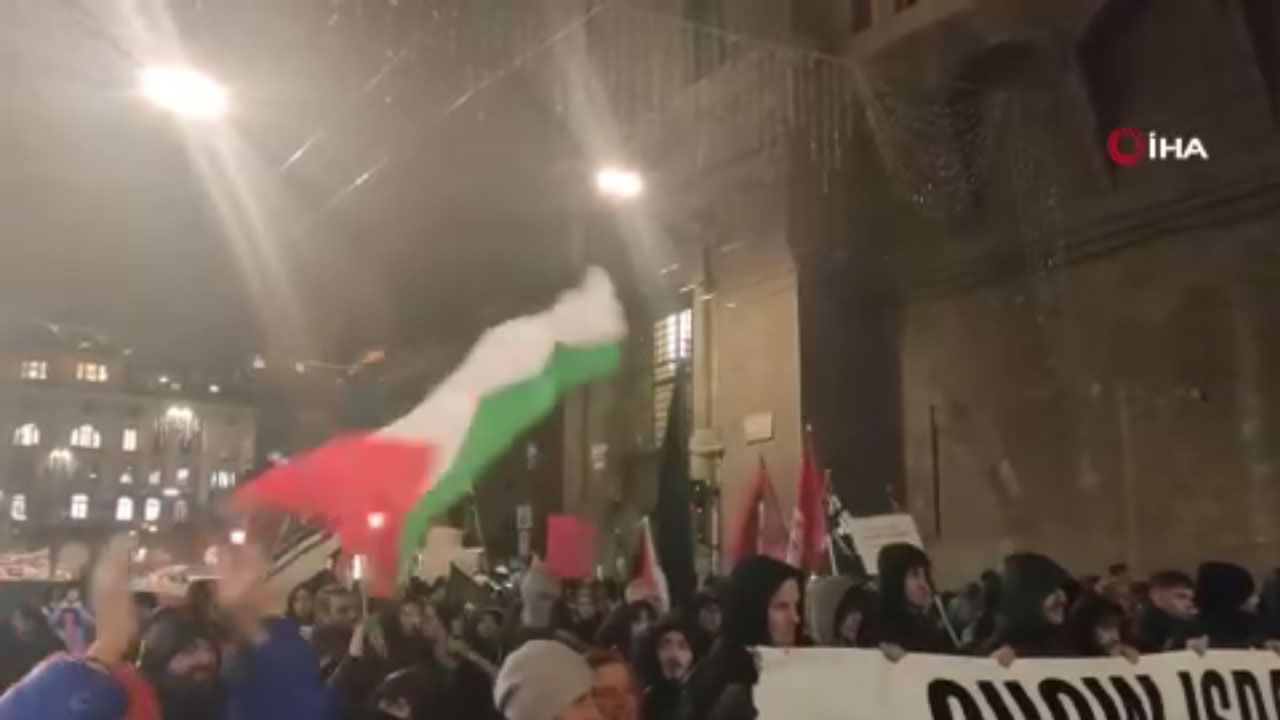 Bologna’da toplanan binlerce kişi, İsrail’in Gazze’de işlediği savaş suçlarını ve insan hakları ihlallerini protesto etmek için bir araya geldi. Protestocular, Maccabi Tel Aviv takımının kente gelişini “Filistin’e yapılan saldırıların normalleştirilmesi” olarak nitelendirdi.
