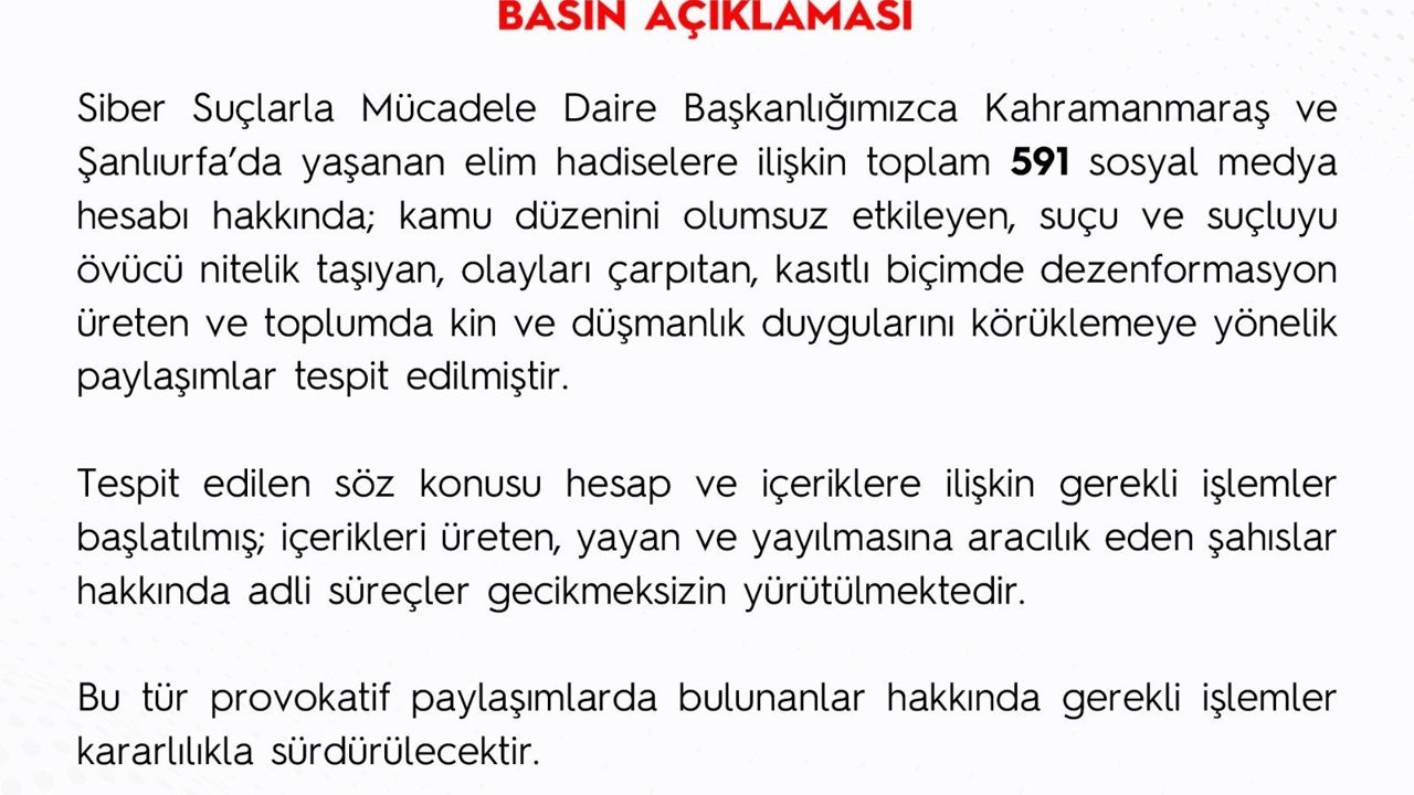 Emniyet Genel Müdürlüğü tarafından yapılan açıklamada, “Siber Suçlarla Mücadele Daire Başkanlığımızca Kahramanmaraş Şanlıurfa'da yaşanan elim hadiselere ilişkin toplam 591 sosyal medya hesabı hakkında; kamu düzenini olumsuz etkileyen, suçu ve suçluyu övücü nitelik taşıyan, olayları çarpıtan, kasıtlı biçimde dezenformasyon üreten ve toplumda kin ve düşmanlık duygularını körüklemeye yönelik paylaşımlar tespit edilmiştir.” ifadelerine yer verildi.