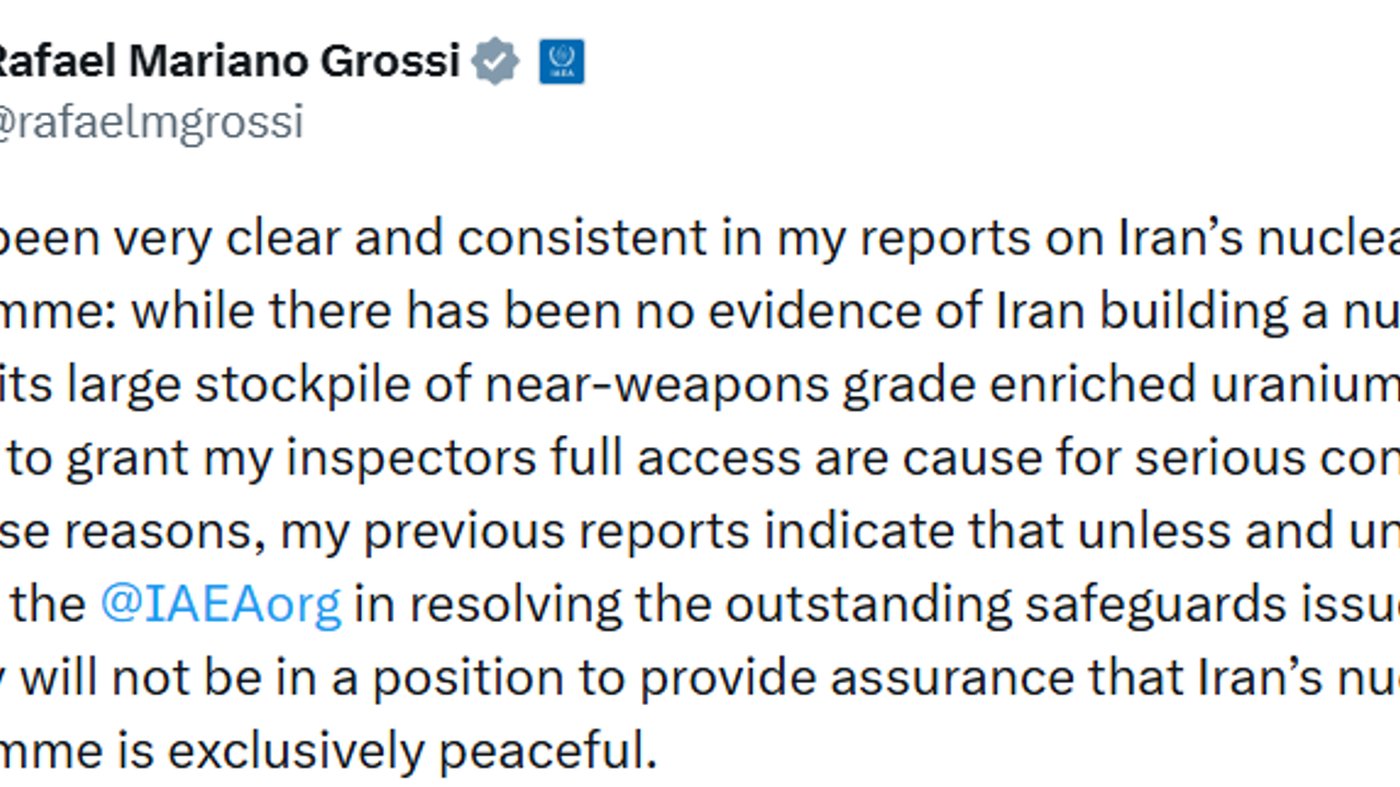 Grossi, İran’ın denetim süreçlerinde tam iş birliği sağlamaması halinde ajansın İran’ın nükleer programının tamamen barışçıl olduğuna dair güvence veremeyeceğini belirtti.