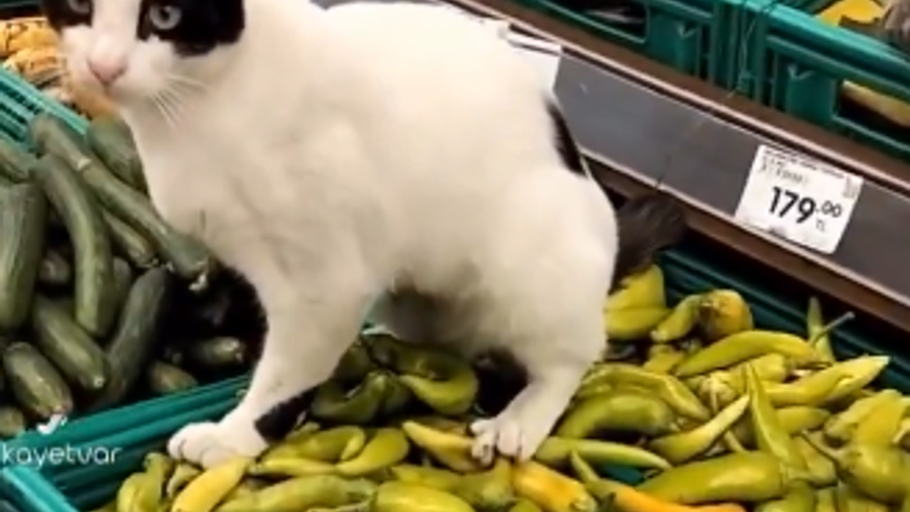 Edinilen bilgilere göre marketin sebze reyonunda gezen kedi, biberlerin bulunduğu rafın üzerine işedi. Durumu fark eden müşteriler, hem şaşkınlık hem de tepkilerini dile getirdi.